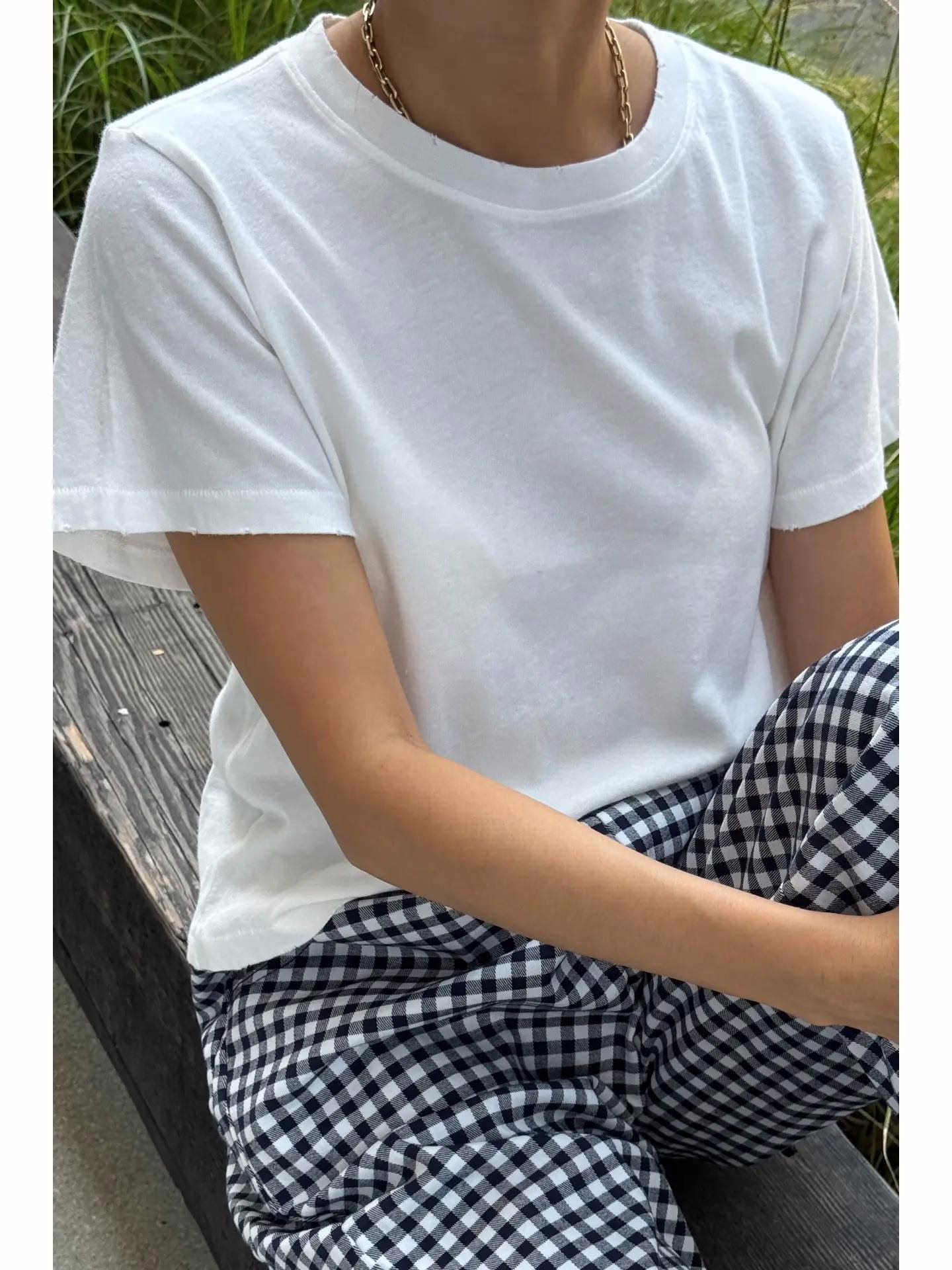 Meet the Darling Tee — It features a relaxed boxy silhouette that hits the perfect waist length, it offers gently distressed details and a 90’s fade for a true vintage allure. Crafted from locally sourced cotton, this tee combines a light, airy feel with a beautifully structured yet soft touch, giving you the vintage feel you long for. We used the softest local 100% cotton* low gauge knit. Garment washed and dyed each tee for a beautiful natural worn-in look. Fabric and garments are made in Made in Los Angeles, USA Content: 100% Cotton Please note: Super soft, dropped shoulder dolman tee with a relaxed fit. The dying and washing process gives each garment unique character. Please allow for slight color and fit variation for each garment.