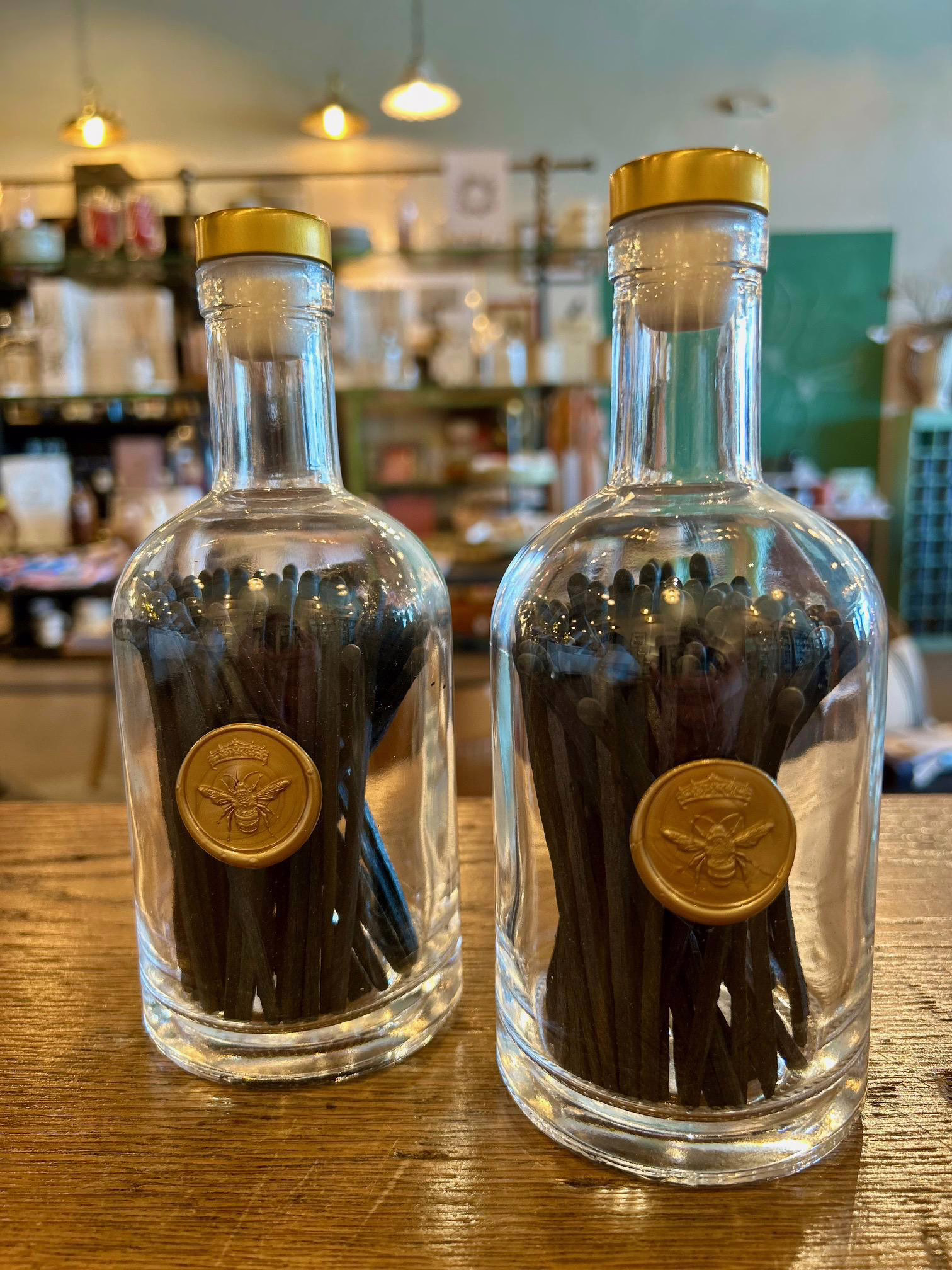 Light your favorite candle in style with our Honey Mercantile Signature Matches. Housed in a clear glass jar topped with a gleaming gold lid, each set is as elegant as it is practical. The jar is adorned with our signature Queen Bee seal, making it a beautiful accent for your coffee table, bedside, or mantle.