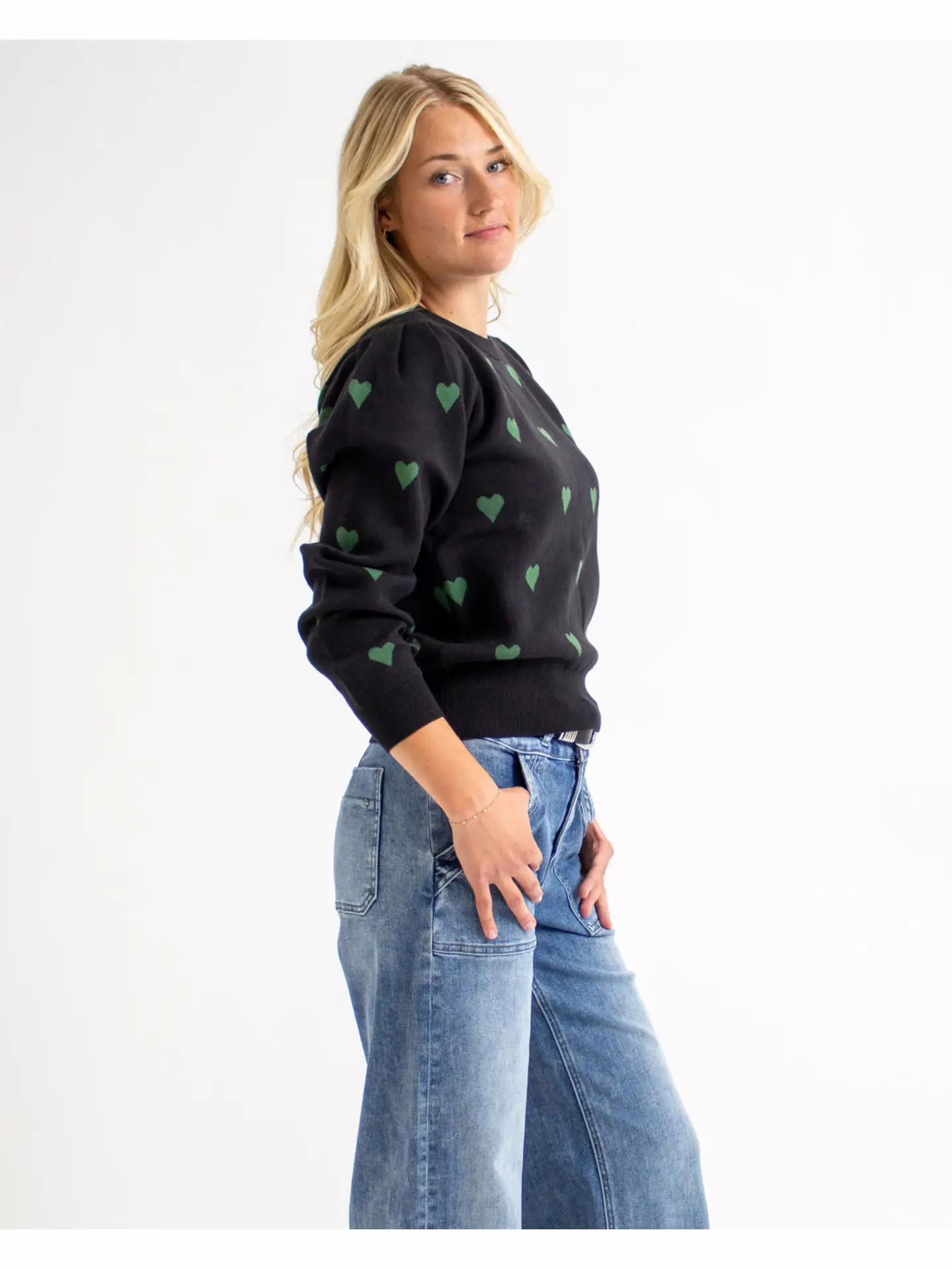 Playful yet effortlessly chic, the Jenna Pullover brings a touch of charm to your everyday look. Featuring a classic crew neckline and long sleeves, this cozy knit stands out with its bold black base and scattered green heart print. Perfect for layering or wearing on its own, the Jenna adds a sweet pop of personality to your wardrobe—ideal for casual days, coffee runs, or a cozy night in.