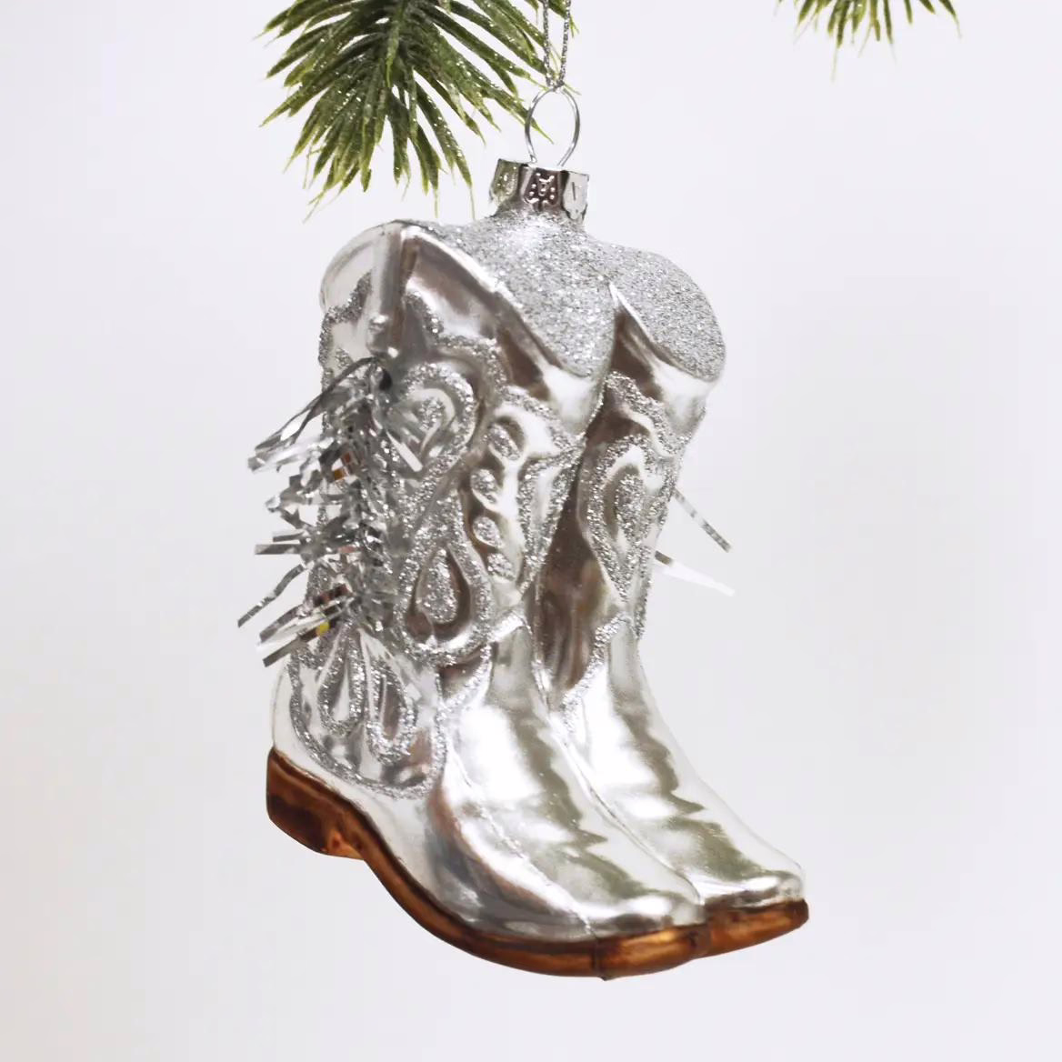 Silver Boots Glass Ornament – Hand-Painted & Festive Add a touch of Western flair to your holiday décor with our hand-painted glass ornament shaped like a pair of classic cowboy boots. Finished in metallic silver with sparkling tinsel fringe, this ornament captures playful charm and festive sparkle in one. Complete with a metallic string for easy hanging, it’s perfect for country enthusiasts, boot lovers, or anyone looking to add a whimsical twist to their tree. A unique and eye-catching keepsake, this ornament is sure to stand out and become a cherished part of your holiday collection.