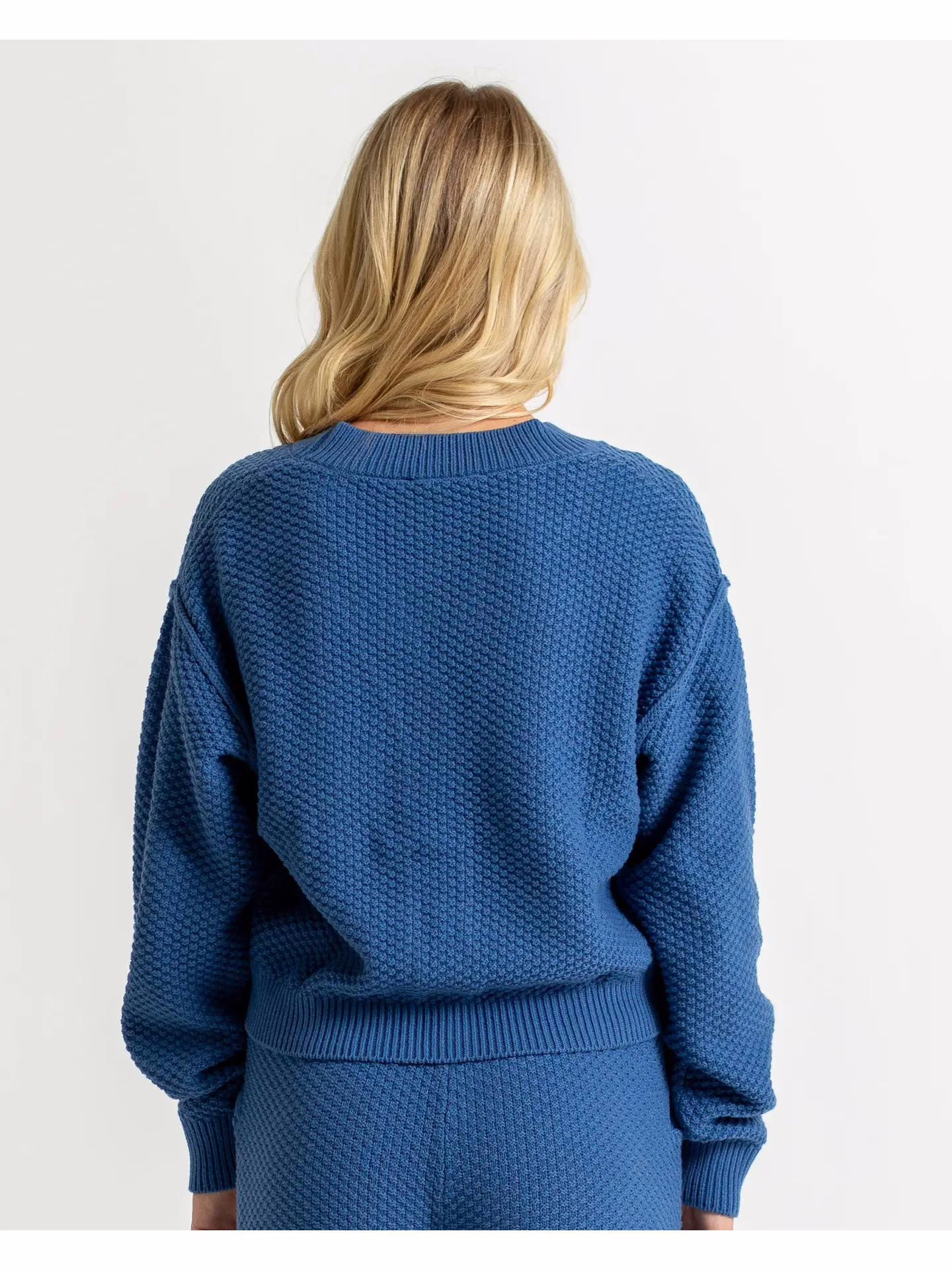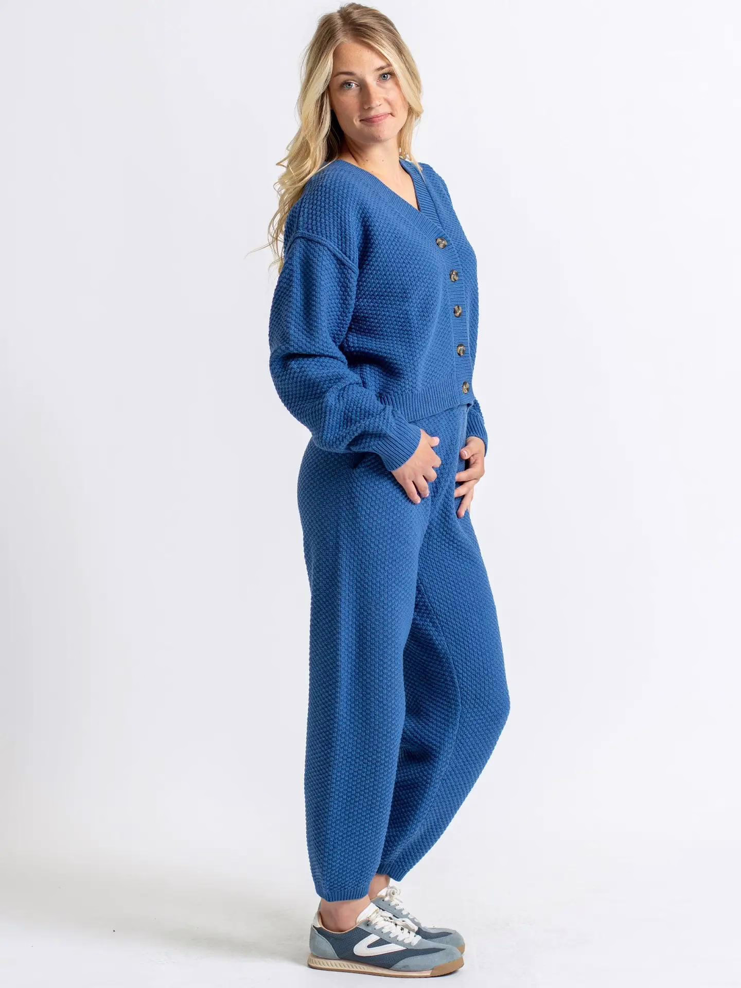 The Sloane Cardigan is a timeless layer in a beautiful shade of blue that feels as chic as it is cozy. With its relaxed dropped sleeves, flattering V-neckline, and soft textured knit, it drapes beautifully for an effortless, elevated look. Pair it with the matching Sloane Joggers or your favorite jeans for an easy, pulled-together outfit that works for any season.