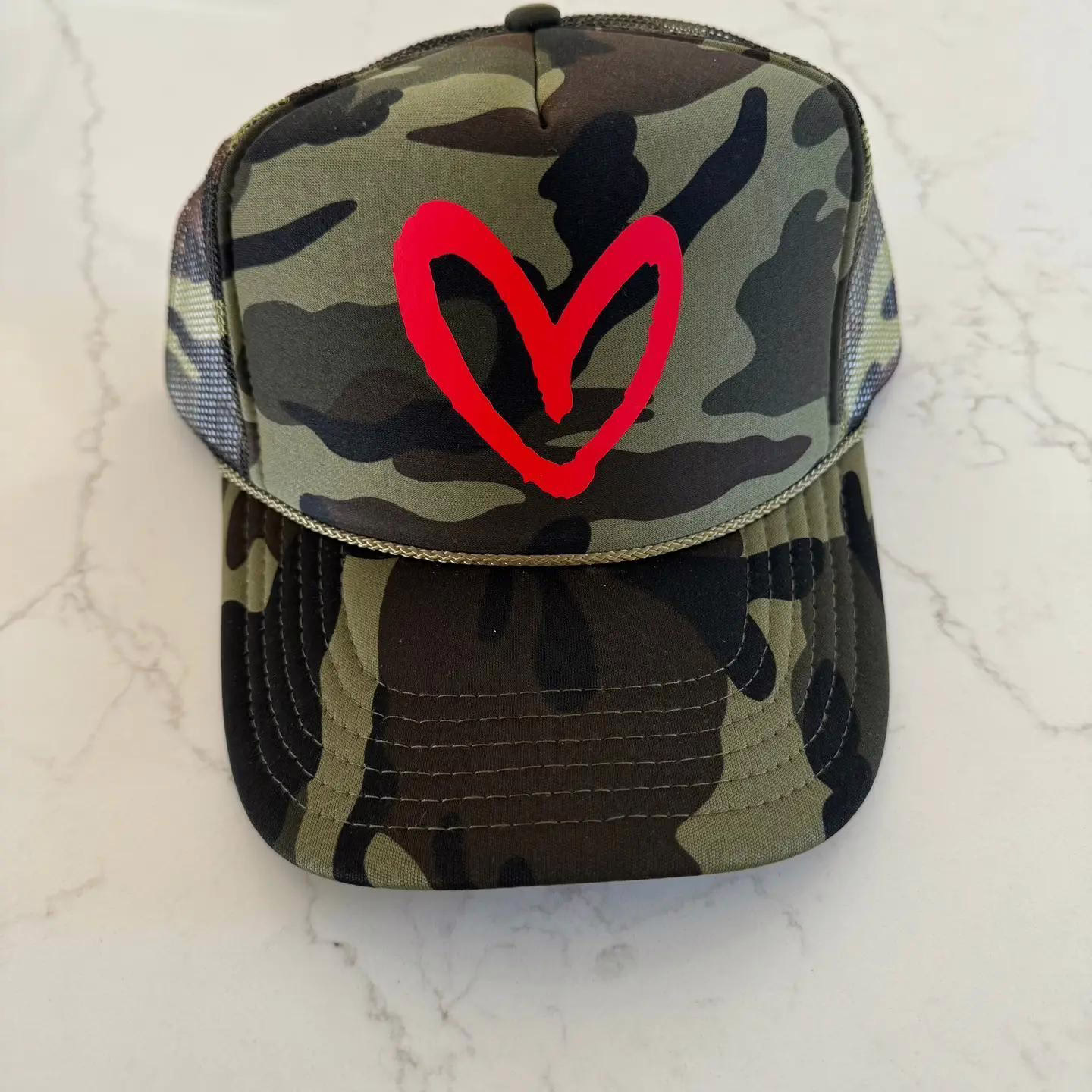 The Sketch Heart Trucker Hat brings a playful edge with a classic camo design finished with a bold red sketch heart graphic. Casual, cool, and full of character, it’s made for effortless everyday styling.